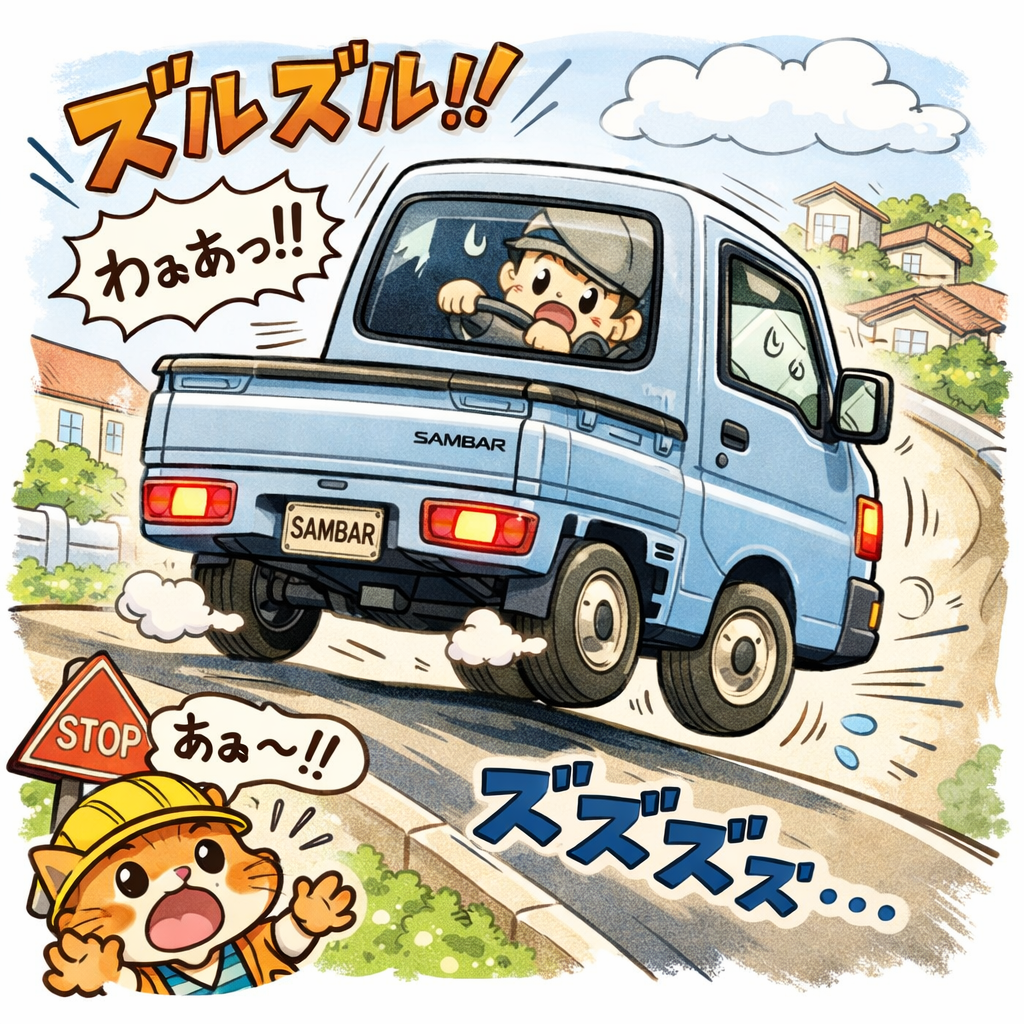 スバルサンバー(特にTV/TW系の3AT車)に乗っていて、「坂道発進でブレーキを離した瞬間、車体が後ろに下がる」という経験をしてヒヤッとしたことはありませんか?
