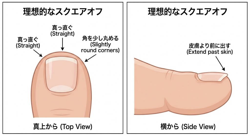 巻き爪を防ぐための正しい切り方「スクエアオフ」は、以下の3点が鉄則です。